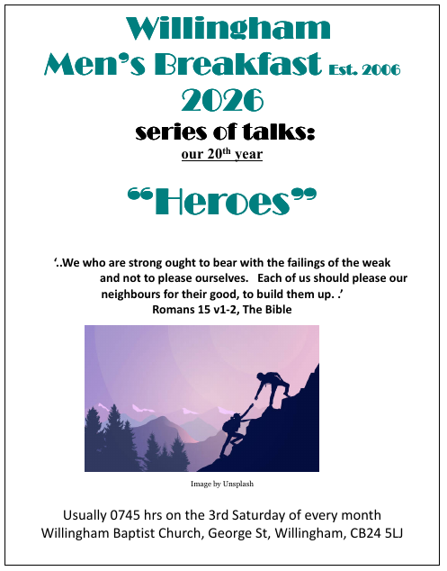 The Talks: We will draw on men’s experiences and stories as many live locally. During these short monthly talks, with maybe a video, or images projected on the large screen at the Willingham Baptist Church.